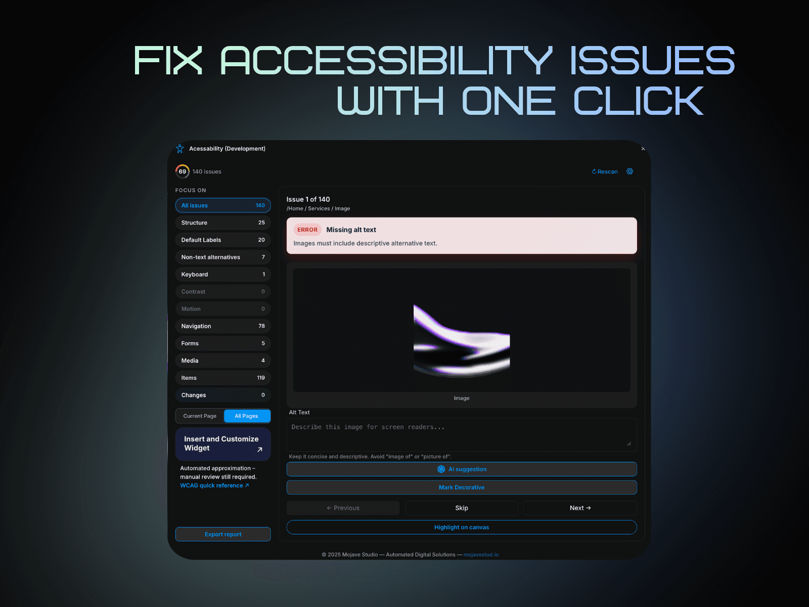 Accessibility for Framer is the fastest way to catch the accessibility issues that quietly slip into Framer projects—before you publish. Run a scan, get clear, actionable results, jump directly to the problem layer, and apply fixes in minutes. It’s accessibility QA that feels like spell-check: quick, focused, and built into your workflow.
